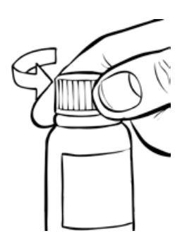 - Coloque o frasco na posição vertical com a tampa para o lado de cima, gire-a até romper o lacre.