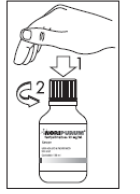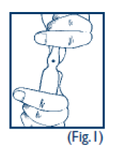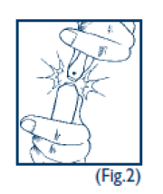 - Quebre a ampola pressionando com o polegar da outra mão a parte superior da ampola e fazendo uma flexão para trás com o dedo indicador (Fig. 2).