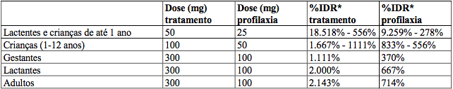 *IDR = Ingestão Diária Recomendada. Cálculos com base na dose diária máxima recomendada em bula.