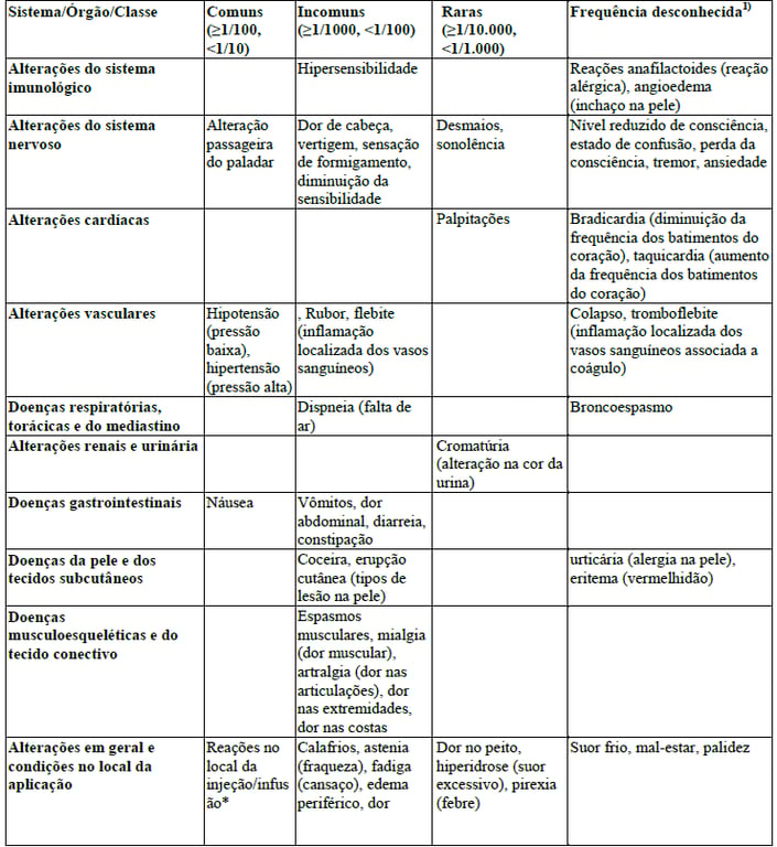 *As mais frequentemente relatadas são: dor, extravasamento, irritação, reações, mudança de cor da pele, inchaço e queimação no local da injeção/infusão.