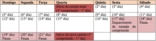 - Deixe de tomar os comprimidos da cartela atual, faça uma pausa de até 7 dias, contando inclusive o dia no qual esqueceu de tomar o comprimido e inicie uma nova cartela. Caso deseje manter o mesmo dia da semana para início de tomada, a pausa pode ser menor do que 7 dias. Por exemplo: se você iniciou a cartela na quarta-feira e esqueceu-se de tomar o comprimido na sexta-feira da última semana, você pode começar a nova cartela na quarta-feira da semana seguinte ao esquecimento, desta forma, você fará uma pausa de apenas 5 dias. Veja esquema ilustrativo abaixo: