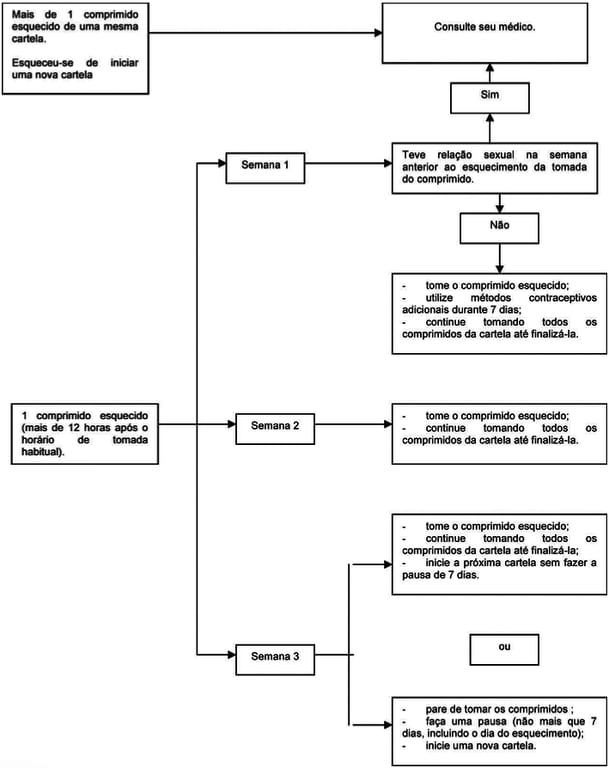 Se você esquecer de tomar mais de um comprimido de uma mesma cartela, consulte seu médico. Quanto mais comprimidos sequenciais forem esquecidos, menor será o efeito contraceptivo. Se não ocorrer sangramento por privação hormonal (semelhante à menstruação) no intervalo de pausa de 7 dias, pode ser que esteja grávida. Consulte seu médico antes de iniciar uma nova cartela.