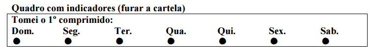 No verso da cartela há um quadro com os dias da semana (como na figura abaixo). Fure o dia da semana correspondente ao dia em que foi tomado o primeiro comprimido. Este também será o dia da semana para o início das demais cartelas, assim como o dia da tomada dos comprimidos de números 8, 15 e 22. Este procedimento auxiliará a verificar se os comprimidos estão sendo tomados na sequência e dias corretos da semana.![]()