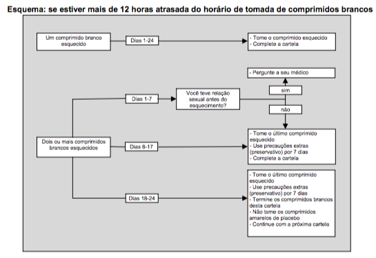 - Se estiver mais de 12 horas atrasada para tomar qualquer comprimido, a confiabilidade da pílula pode ficar reduzida. Quanto maior o número de comprimidos seguidos esquecidos, maior o risco de redução da eficácia anticonceptiva. Existe um risco particularmente elevado de você engravidar se esquecer de tomar os comprimidos brancos ativos do início da cartela ou do final da cartela. Portanto você deve seguir as orientações descritas a seguir.