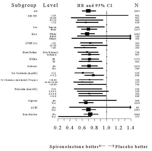 Os índices de risco de mortalidade para alguns subgrupos são mostrados na Figura 2. O efeito favorável da espironolactona na mortalidade se mostrou semelhante em ambos os sexos e em todos os grupos etários, exceto em pacientes abaixo de 55 anos; não havia não brancos em número suficiente no estudo RALES para obter qualquer conclusão sobre efeitos diferenciais por raça. O benefício da espironolactona se mostrou maior em pacientes com níveis de potássio sérico baixos na linha de base e menor em pacientes com frações de ejeção <0,2. Estas análises de subgrupo devem ser interpretadas com cautela.