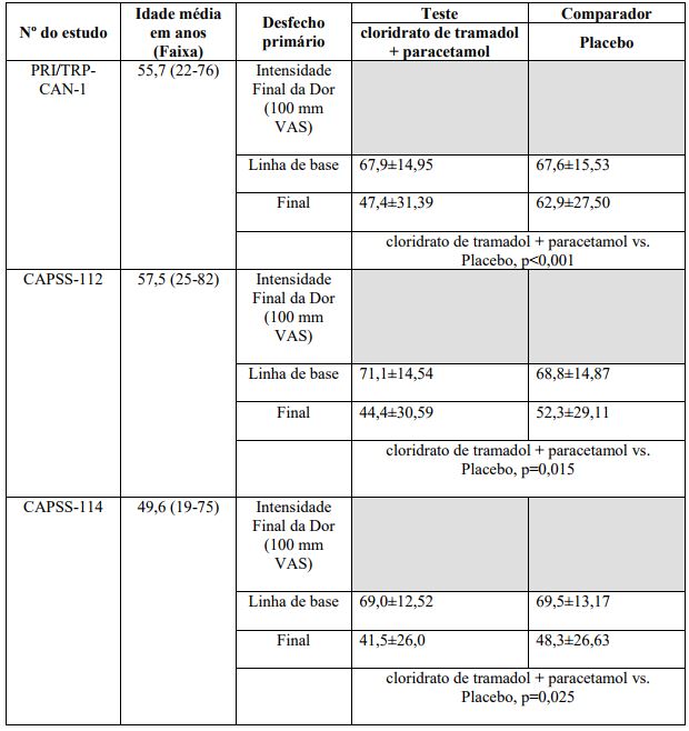 Nos estudos CAPSS-112 e TRP-CAN-1 foram incluídos 654 pacientes com dor lombar crônica que foi suficientemente grave para requerer medicação diariamente nos três meses anteriores e ao menos dor moderada (40/100 mm) na VAS. A média diária de doses de Cloridrato de Tramadol + Paracetamol (substância ativa) para CAPSS-112 e TRP-CAN-1 foi 159 mg de tramadol/1391 mg de paracetamol e 158 mg de tramadol/1369 mg de paracetamol, respectivamente.